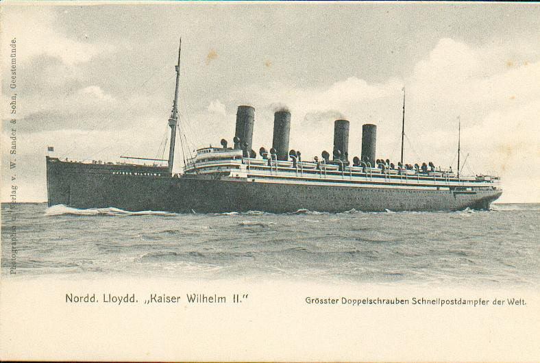 Am 12. August 1902 lief das zweite Schwesterschiff der Kaiser Wilhelm der Große auf der Vulcan-Werft in Stettin vom Stapel. Benannt wurde sie nach dem damaligen deutschen Kaiser. Nach acht Monaten Innenausbau begann sie am 14. April 1903 ihre Jungfernfahrt von Bremen nach New York auf. Wie bei der Deutschland hatte auch die Kaiser Wilhelm 2 starke Vibrationen, die bei hohen Geschwindigkeiten auftraten. Dieses Problem löste man ein Jahr später mit einem Satz neuer Schiffsschrauben. Die Vibrationen wurden auf ein erträgliches Minimum reduziert und als Nebeneffekt lief das Schiff nicht nur deutlich ruhiger sondern auch schneller. Im Juni 1904 stellte sie mit 23,58 Kn stellte in West-Ost-Richtung den alten Rekord der Deutschland ein, was ihr jedoch in der Gegenrichtung nie gelingen sollte (5 Tage, 11 Stunden, 58 Minuten).