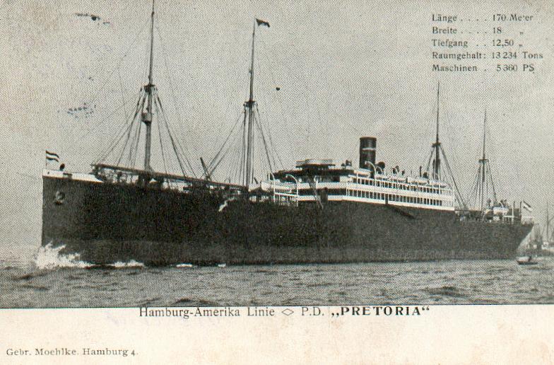 Die Pretoria wurde 1897 bei Blohm & Voss in Hamburg für die HAPAG gebaut. Sie bekam einen Schornstein, vier Masten sowie eine Schraube, um etwa 14Knoten erreichen zu können. Sie besaß Platz für 162 Passagiere in der 1., 197 in der 2. und 2382 Passagiere in der 3.Klasse.