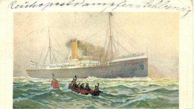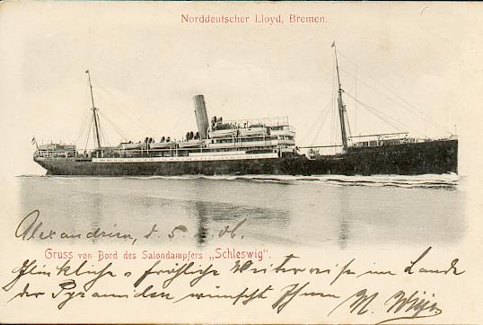 Die Schleswig gehörte zur Klasse der Dampfer für Mittelmeer-Dienste. Sie wurde von der Vulcan werft in Stettin gebaut und lief am 10.Mai 1902 vom Stapel. Sie besaß einen Schornstein und zwei Masten sowie eine Geschwindigkeit von 14Kn. Sie konnte 150 1.Klasse, 56 2.Klasse und 950 Zwischendeckspassagiere beherbergen. Ihre Jungfernreise fand am 14.September 1902 von Bremerhaven zum La Plata. Damit war sie für kurze Zeit der größte Südamerika Dampfer, welcher die kleineren Cap-Dampfer der Hamburg-Süd übertraf.